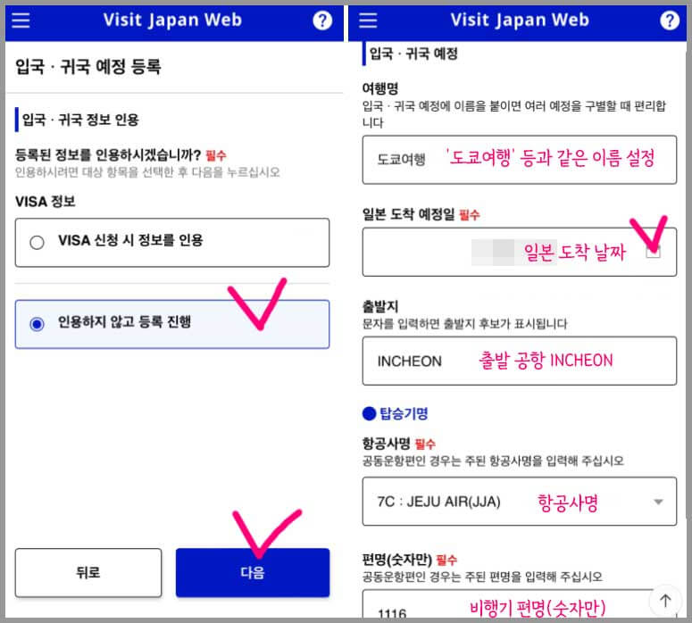 일본 입국, 귀국 정보를 입력합니다. 비자는 '인용하지 않고 등록'을 클릭합니다.