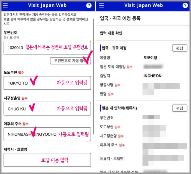 호텔 바우처를 확인 후 우편번호를 입력하고 '우편번호 자동입력'을 클릭하면 정보가 자동으로 입력됩니다. 호텔이름과 호텔 전화번호를 입력합니다.