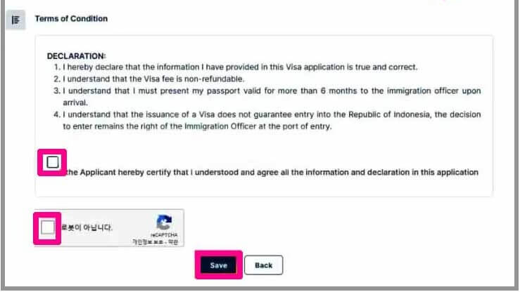 여권정보, 개인정보, 사진등록 입력하고 동의를 누릅니다. Save를 클릭 후 넘어갑니다.