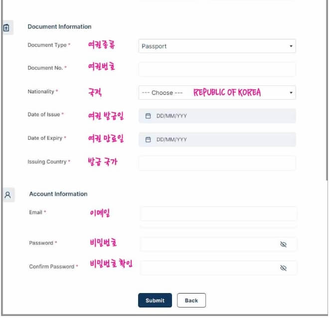 개인정보와 여권정보를 여권을 펼쳐놓고 정확하게 입력합니다. 이메일 주소는 현재 사용 중인 메일 주소를 정확하게 입력합니다.