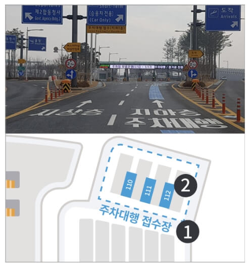 - 터미널 진입 시 주차대행 정용차선으로 진입합니다.(파란색 바닥라인 표시)