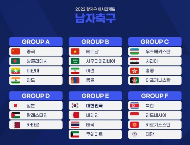 2022(2023) 항저우 아시안게임 축구 일정은 9월 19일(화) ~ 10월 7일(토)까지입니다. 항저우 아시안게임 남자축구는 바레인, 태국, 쿠웨이트가 속해있는 그룹 E입니다. 이번 축구는 3년 연속 금메달에 도전합니다. 금메달을 딸 경우 군면제이기 때문에 선수들의 간절함이 크겠네요.