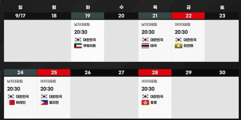 - 대한민국 / 바레인 : 9월 24일(일) 저녁 8시 30분